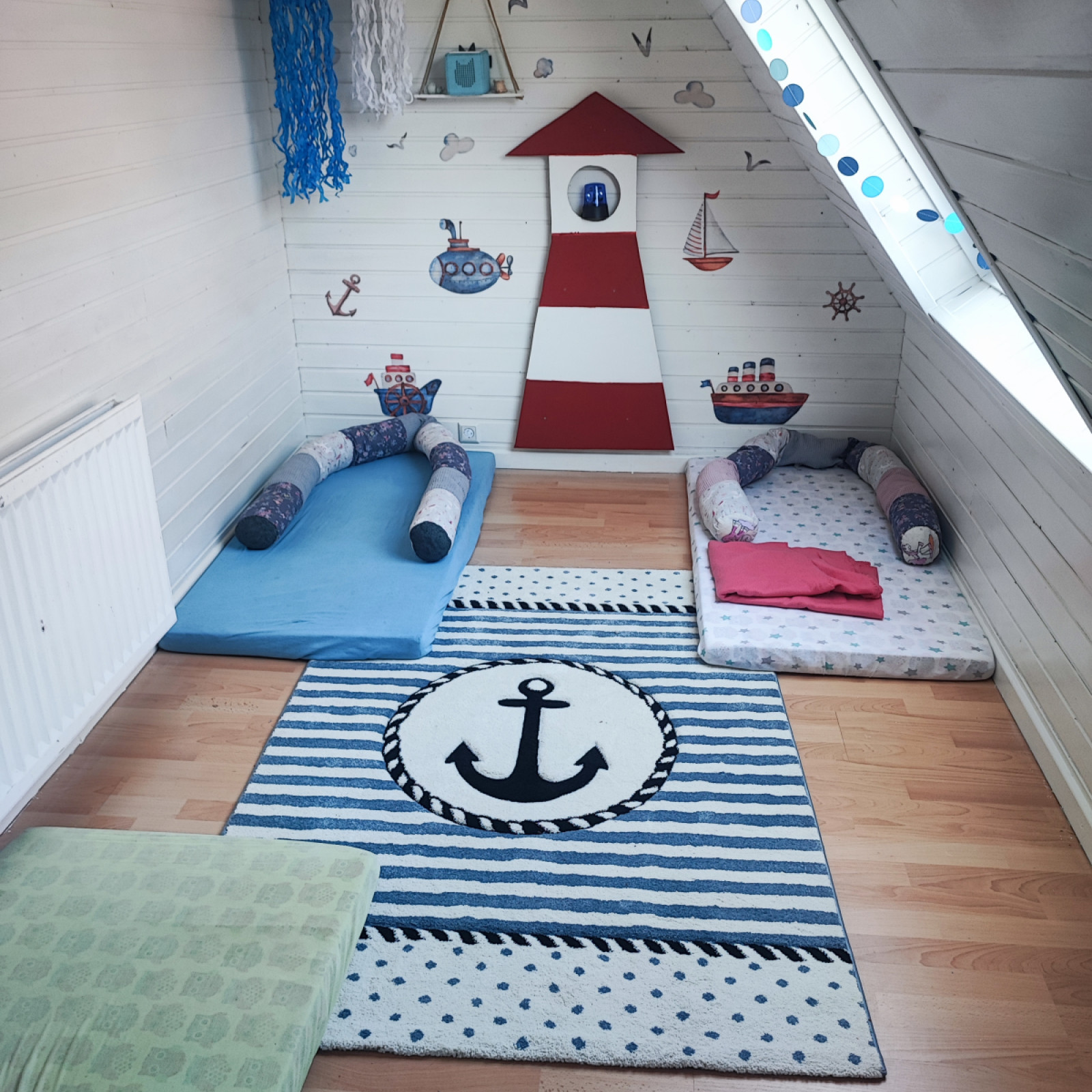 Kinder haben besondere Bedürfnisse an die Einrichtung: der Waschbereich hat einen Wickeltisch, niedrige Waschbecken und eine separate Toilette. Für den Mittagsschlaf oder um sich auszuruhen gibt es den Schlafbereich mit einer eigenen Matratze für jedes Kind. Die Küche ist besonders wichtig: hier bereiten wir – auch oft gemeinsam mit den Kindern – die Mahlzeiten zu und lassen es uns zusammen am großen Tisch schmecken. In den Räumen gibt es verschiedene Bereiche zum Basteln oder Spielen – mache Bereiche werden auch für verschiedene Anlässe umgeräumt. In den Räumen wird natürlich nicht geraucht.